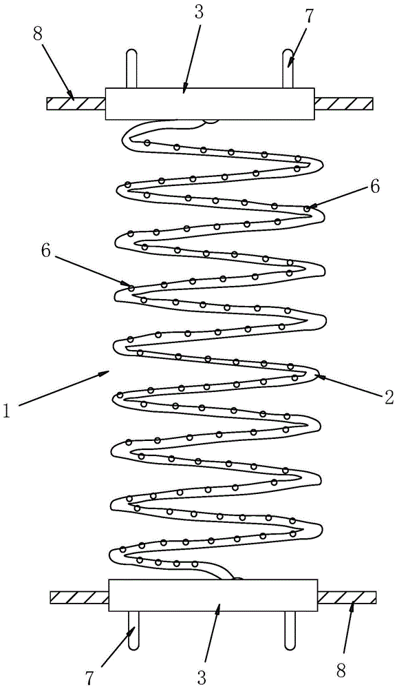 一種彈簧,如圖1至圖2所示,包括彈簧本體1,彈簧本體1由彈簧鋼絲2螺旋環(huán)繞而成,還包括位于彈簧本體1兩端的連接焊板3,彈簧鋼絲2的兩端均設(shè)置有彈性定位球體4,所述連接焊板3靠近彈簧鋼絲2的一端均設(shè)置有用于裝設(shè)所述彈性定位球體4的球形凹腔5,彈簧鋼絲2的兩端均與連接焊板3焊接;所述彈簧鋼絲2等間隔設(shè)置有多個(gè)彈性凸粒6。具體地,本實(shí)用新型結(jié)構(gòu)新穎,設(shè)計(jì)巧妙,利用在彈簧鋼絲2等間隔設(shè)置有多個(gè)彈性凸粒6,多個(gè)彈性凸粒6與彈簧鋼絲2相互抵接,提高彈簧鋼絲2被壓縮后的彈力以及恢復(fù)力,延長使用壽命;另外,在將彈簧鋼絲2的兩端與連接焊板3焊接前,先將彈性定位球體4塞入所述球形凹腔5內(nèi)對(duì)彈簧鋼絲2的兩端進(jìn)行定位,然后再進(jìn)行焊接,保證彈簧鋼絲2與連接焊板3的焊接精度,提高產(chǎn)品質(zhì)量;其中,彈性凸粒6和彈性定位球體4均可為彈性塑膠體或者彈性橡膠,所述球形凹腔5設(shè)置有用于供彈性定位球體4塞入的開口,所述開口的直徑小于所述彈性定位球體4的直徑。